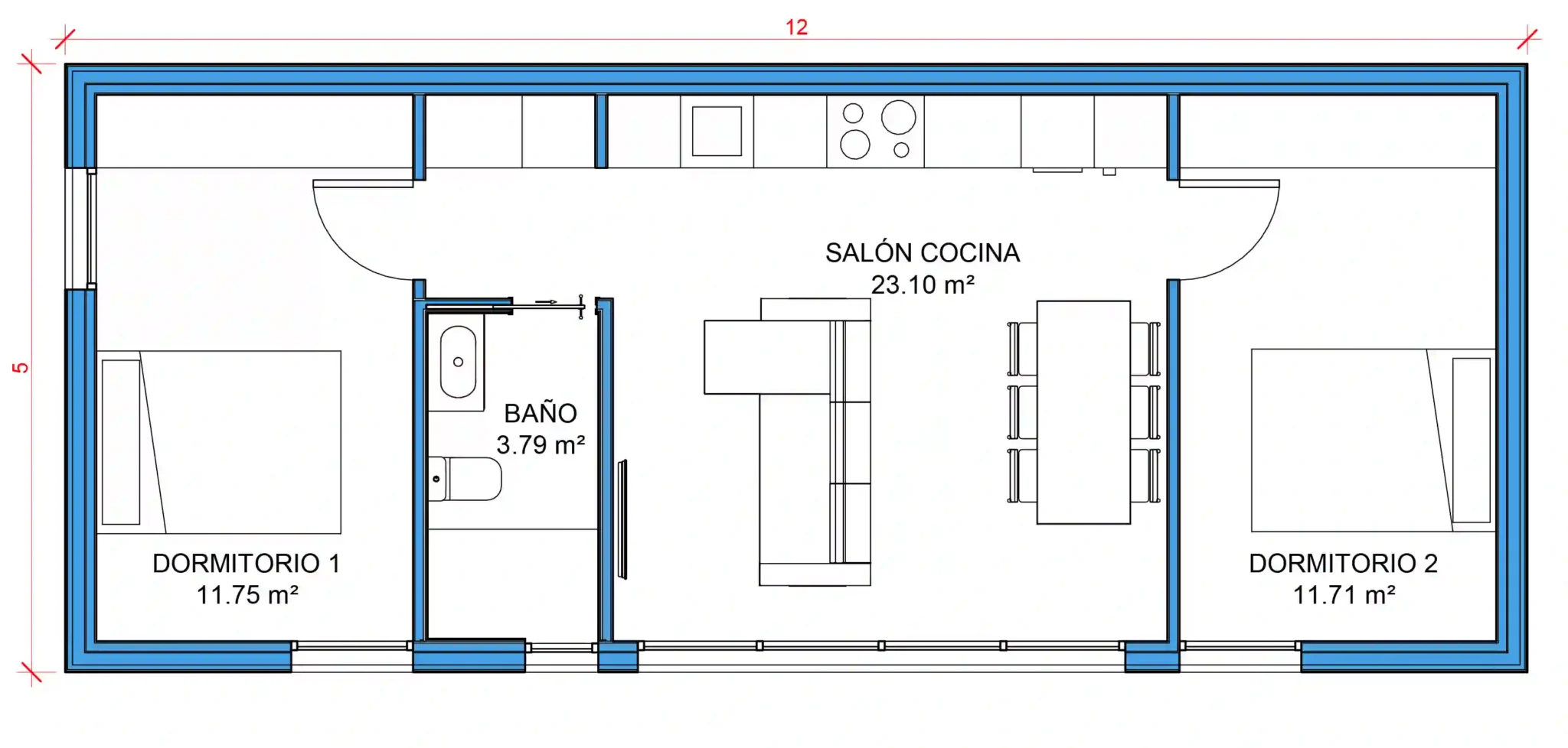 El corazón de esta vivienda es un salón-cocina de 23 m², un espacio diáfano pensado para compartir, cocinar y relajarse. Los ventanales de suelo a techo permiten disfrutar de vistas al exterior y un ambiente luminoso durante todo el día.