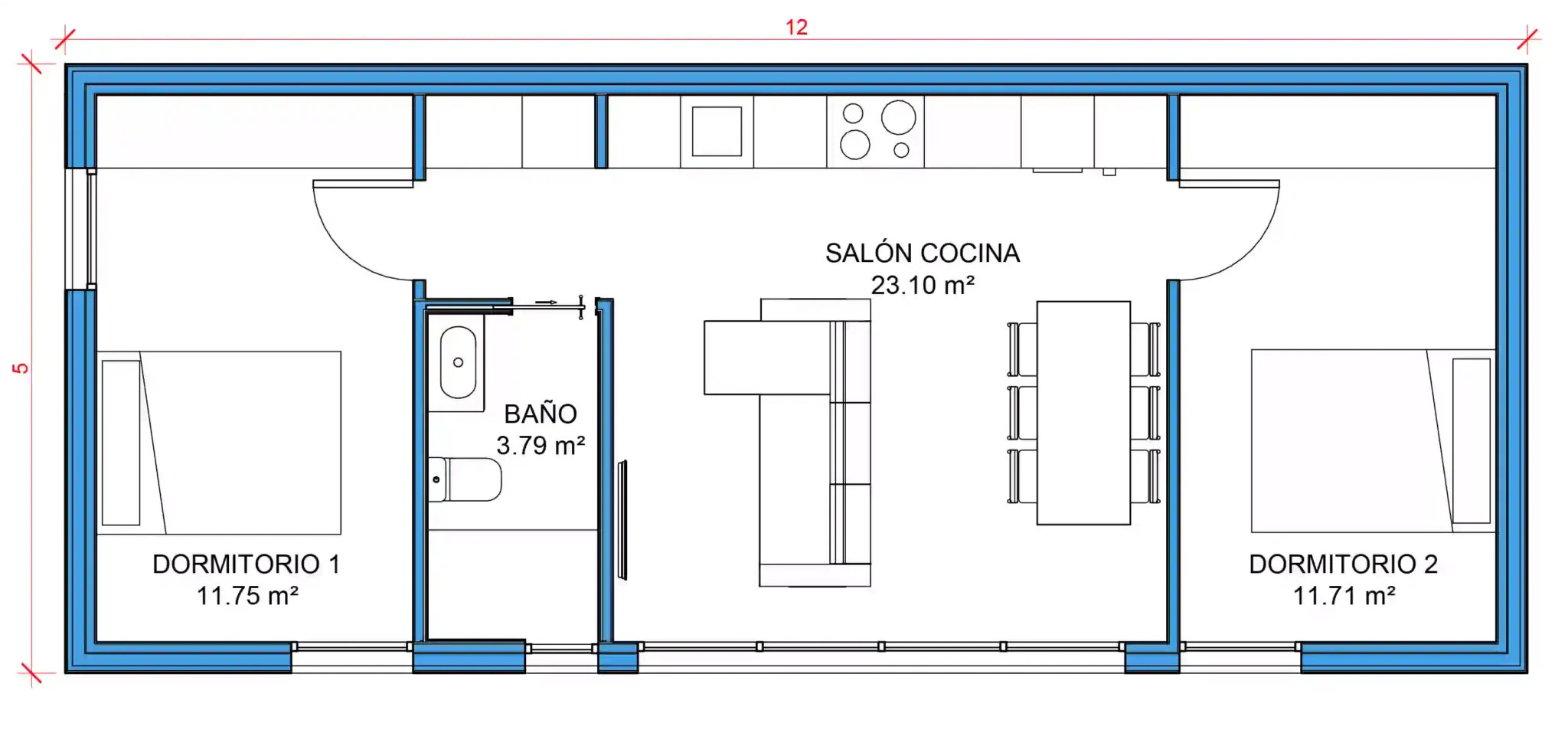 • Dos dormitorios amplios de más de 11 m² cada uno.