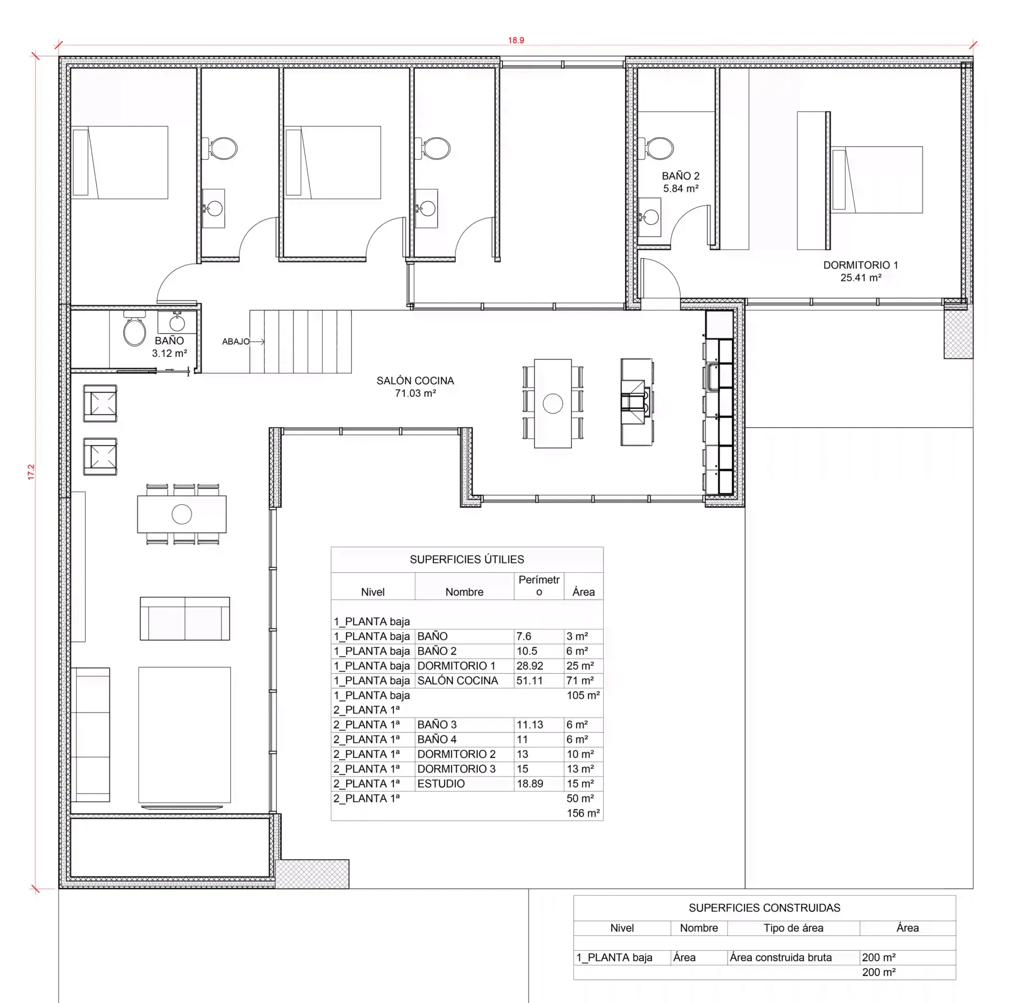 En la planta superior, se distribuyen tres dormitorios adicionales, dos baños completos y un estudio de 15 m² que puede utilizarse como oficina, sala de juegos o zona de trabajo. El dormitorio principal, de 25 m², cuenta con baño en suite, garantizando la máxima comodidad y privacidad.